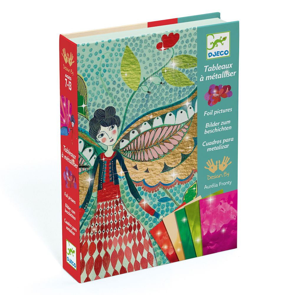 Εικαστική δημιουργία της εταιρίας Djeco. Ξεκολλήστε τα αυτοκόλλητα με τα νούμερα από τις καρτέλες και εφαρμόστε πάνω τους το μεταλλικό φύλλο χρυσού (Foil)! Θα δείτε να εμφανίζονται μπροστά σας όλο λάμψη, παραμυθένιες νεραΐδες και πριγκίπισσες! Το σετ περιλαμβάνει 4 καρτέλες, 15 πολύχρωμα μεταλλικά φύλλα χρυσού, 1 εργαλείο που βοηθάει στην κατασκευή, βιβλιαράκι με εικονογραφημένες οδηγίες. Κατάλληλο από 7 έως 13 ετών.