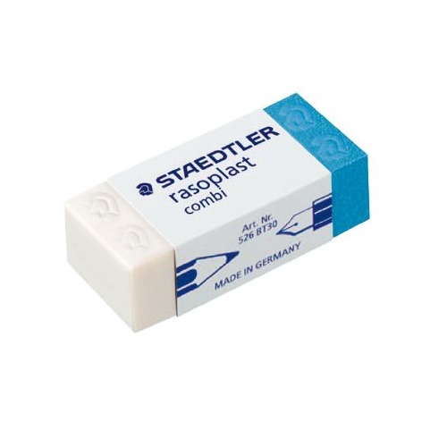 Γόμα της Staedtler για μολύβι και στιλό. Με το λευκό τμήμα σβήνει μολύβι και με το μπλε μελάνι.