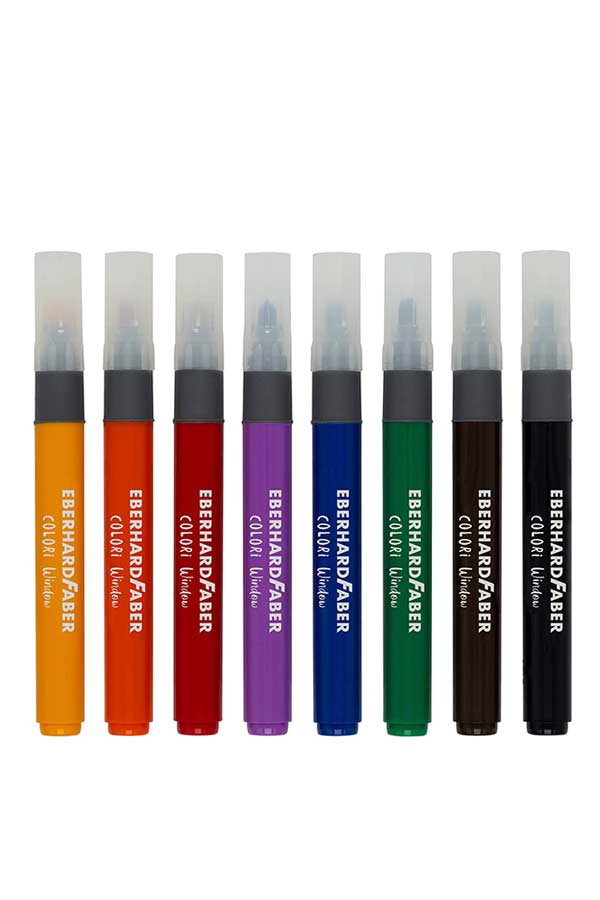 Μαρκαδόροι με μελάνι για ζωγραφική σε γυαλί της εταιρείας EBERHARD FABER. Μπορούν πολύ εύκολα να αφαιρεθούν από τις λείες επιφάνειες χρησιμοποιώντας μόνο νερό. Στην συσκευασία περιλαμβάνονται και 3 στένσιλ με σχέδια.