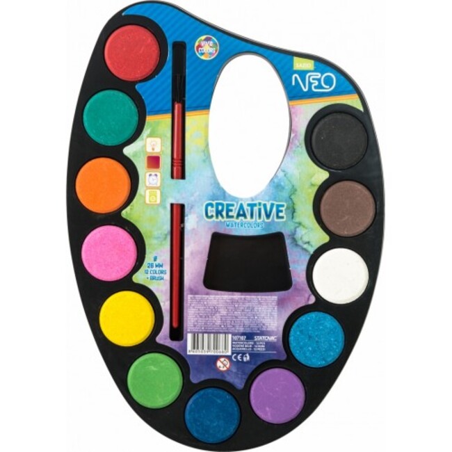 Η συσκευασία περιέχει 12 ζωντανά διαφορετικά χρώματα και 1 πινέλο σε πλαστική βάση με σχήμα παλέτας.